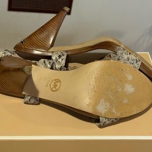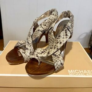 Stylish Michael Kors slingback heels. Beige snake-print straps with crisscross design. Open toe and wood-look footbed. Elastic slingback for a secure fit. Silver hardware Versatile for dressy or casual wear.