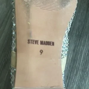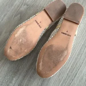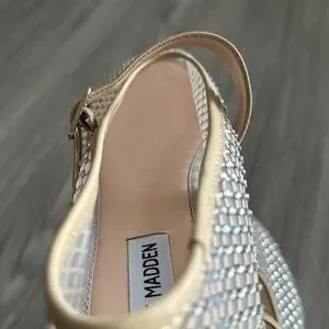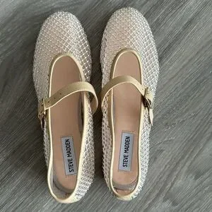 These are like new **size 9 but FIT LIKE 8** Steve Madden Mary Jane flats with metallic gold trim and buckle. Nude mesh upper with diamond-patterned silver-tone overlay. Cushioned insole for comfort. Elegant, versatile design for day or evening wear.