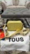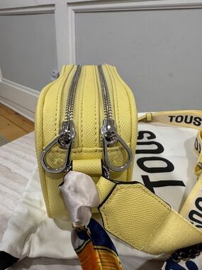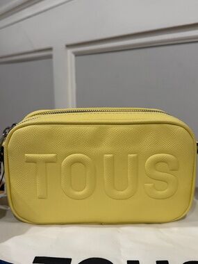 Bright yellow crossbody camera bag with embossed TOUS logo. Includes wide branded strap and colorful scarf accent. Clean, modern silhouette. Great for everyday wear.