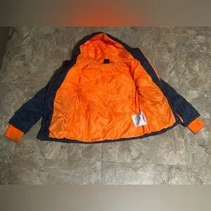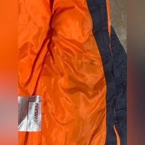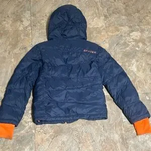 Featuring a bright orange interior lining and inner sleeve cuffs. Front has the Spyder brand as well as the back. Sporty, high-visibility colorway. Clean, bold styling, warm, perfect for snow/cold.