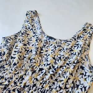 Button-front dress featuring a navy base with white floral print. Yellow centers add a pop of color. Lightweight fabric with a classic neckline. Casual and feminine style.
