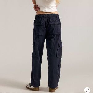 Deep navy drawstring cargo pants with multiple flap pockets. Relaxed fit and utility styling. Versatile everyday piece. Pair with casual tops for an easy look.