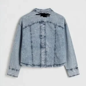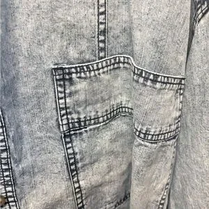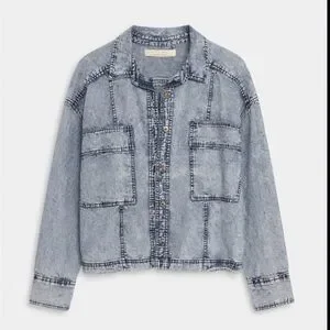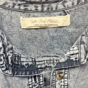 Chic Free People denim jacket with an acid-wash finish. Button-front closure and two large chest patch pockets. Relaxed, boxy silhouette with contrast seam detailing. Lightweight layer with a soft, worn-in look.
