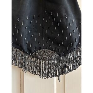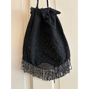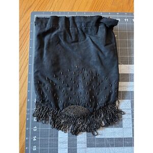 Vintage Black Satin Beaded Fringe Drawstring Pouch Evening Bag Flapper Gatsby