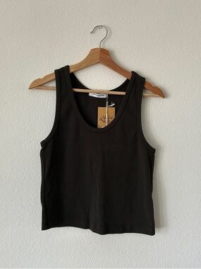 Sleeveless ribbed tank with a scoop neckline. Wide shoulder straps and a fitted cut. Simple piece for layering or wearing alone.