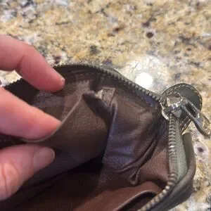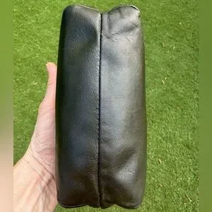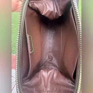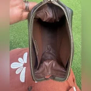 Good condition, outside olive leather, inside brown leather. 2 interior slip pockets. Great for cosmetic products or phone chargers. Signs of stretch/ tear for both inside slip pockets. Dimensions H 5” L7” W3”.
