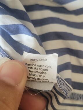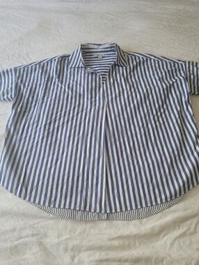 Madewell Shirt Womens Medium Blu Striped Cotton Buttons Collared Relaxed Coastal. Measures 26 inches from pit to pit, 27 inches long. Has light wash wear and a small hole near the left shoulder-- see photo.