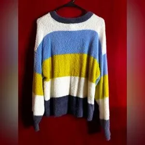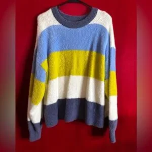 Soft plush crewneck with bold colorblock stripes. Features sky blue, bright yellow, white and charcoal bands. Cozy and lightweight for everyday wear. Easy to style with jeans or skirts.