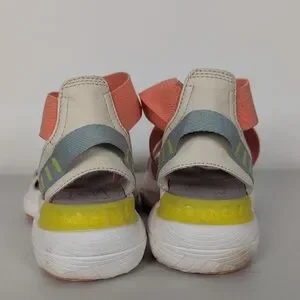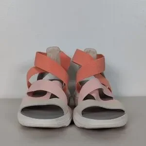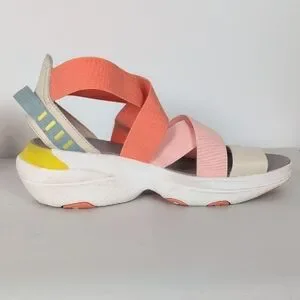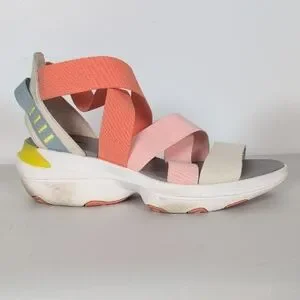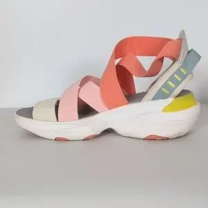 Tan, pink, orange, yellow, white, and gray. Slip on style. Elastic, stretchy straps. Excellent condition -- some light discoloration on the soles, but no stains, holes, or fraying. Very comfy, great for lots of standing and walking on warm days.