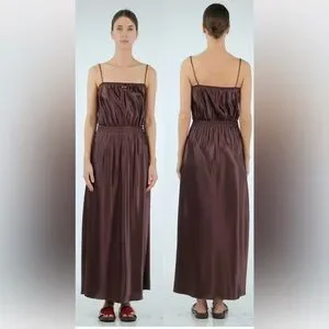 Sleek satin midi dress by Miu Miu. Thin spaghetti straps and a gathered elastic waist. Smooth, glossy finish with a straight silhouette. Elegant, minimalist design for day or evening.