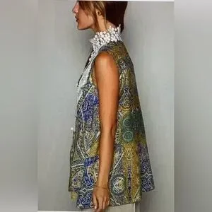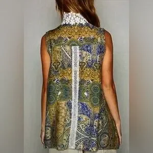 Sleeveless paisley tunic. White lace bib front with textured trim. Multicolor paisley print in green, gold and blue tones. Lightweight and flowy silhouette. Versatile and boho-chic.
