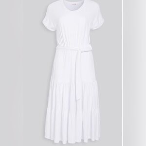 Bright coral-colored crewneck tee maxi dress . Short sleeves and a classic fit. Lightweight knit with subtle texture. Easy, everyday style.