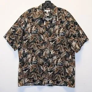 Authentic vintage Pierre Cardin short sleeve button-down featuring a bold tropical leaf print in earthy tones on a black background.