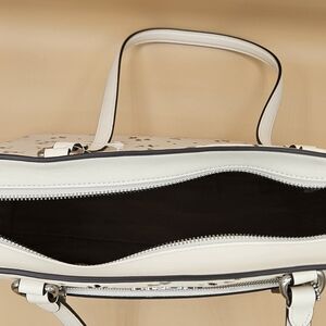 Spacious white leather tote with delicate floral print. Stud and star accents add shine. Comfortable double shoulder straps. Front slip pocket for quick access. Silver-tone Coach logo hardware.