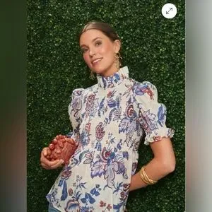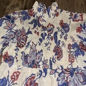 Smocked high neckline with ruffle trim. Short puff sleeves with elastic cuffs. Floral print in blue and cream with rust accents. Lightweight, feminine silhouette. Easy to dress up or down.