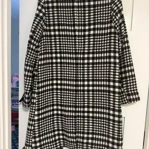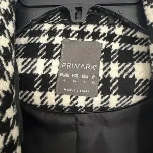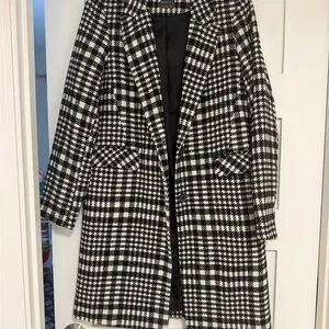 Structured pea coat in a bold houndstooth pattern. Single-button front with flap pockets. Fully lined for smooth layering. Timeless monochrome style for versatile wear.
