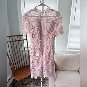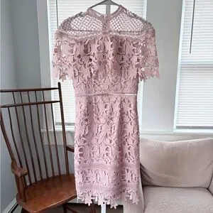 Feminine blush pink midi dress with intricate crochet lace overlay. High neckline and scalloped hem add delicate detail. Short lace sleeves and fitted waist create flattering shape. Lined for comfort and modest coverage. Ideal for weddings, parties, or special events.