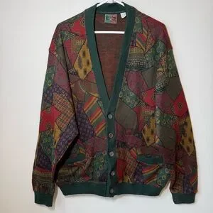 Patchwork pattern knit oversized cardigan wool blend pockets multicolor vintage