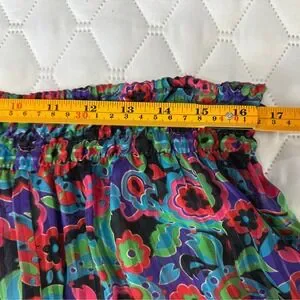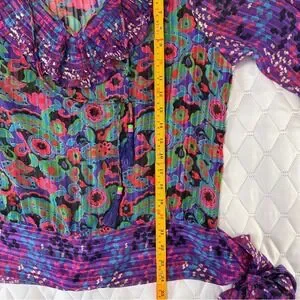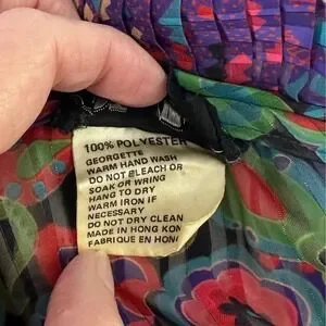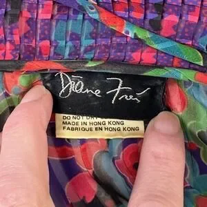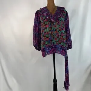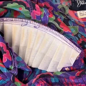 Step into a world of vibrant artistry with this stunning vintage Diane Freis two-piece ensemble. This set captures the essence of bohemian luxury, featuring an intricate floral and geometric print in purple, teal, and red. The georgette fabric is delicately pleated, creating a fluid silhouette that moves with every step. The top boasts a romantic ruffled collar with tassel ties and signature smocked detailing.