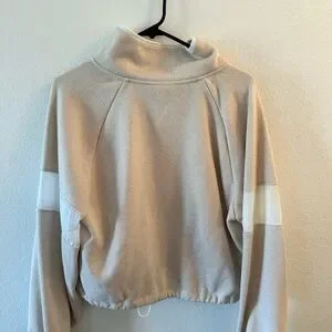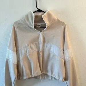 EUC Soft cream knit crop sweatshirt with subtle embroidered PINK patch. Simple branded detail for everyday wear. Versatile, neutral layering piece.