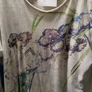 Light cream Magnolia Pearl short sleeve tee. Delicate watercolor-style floral print across the front. Soft, drapey fabric with a relaxed fit. Artistic, vintage-inspired look.