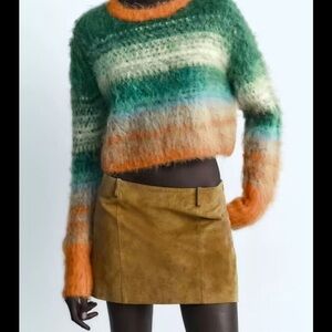 Zara Multicolor Fuzzy Striped Crewneck Sweater - Green, Orange, Cream