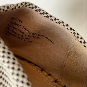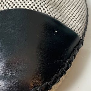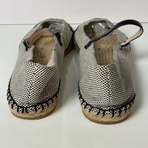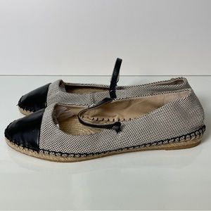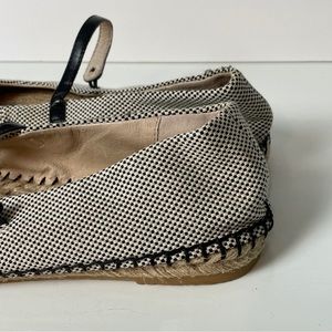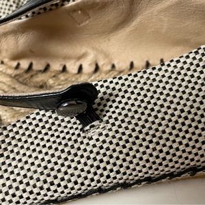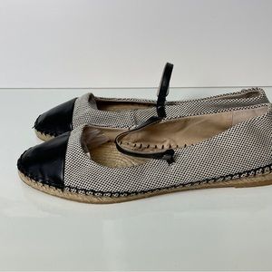 Cap toed flats with jute insole and strapped closure. Checked pattern is canvas textile. These have never been worn, but do have a couple blemishes to the toes. Left toe has white show through and both have some faint scuffing. Label on right insole was removed. Marked as size 41, which is equivalent to size 10 in this brand.