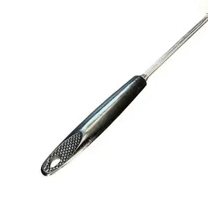 Vintage EKCO chromium plated slotted spatula features a classic mid-century design with a durable black composite handle. This essential kitchen tool is crafted in the USA, offering a sturdy construction ideal for flipping eggs, burgers, or pancakes. The handle includes a convenient hanging hole for easy storage, while the slotted head allows for efficient drainage of fats and liquids.