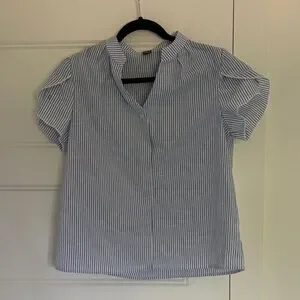 EMERY ROSE Blue & White Striped V-Neck Ruffle Sleeve Women's Blouse