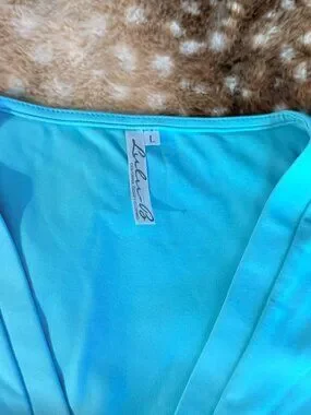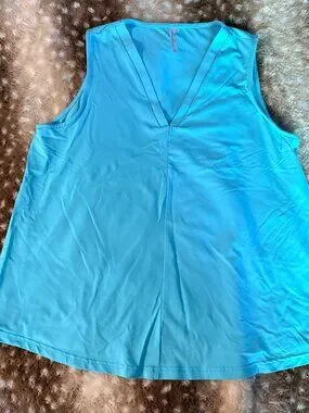 Lulu-B sleeveless blouse bundle with two flowy tops, one teal light blue V-neck and one bright pink tropical flamingo print, both lightweight and stretchy with an easy relaxed fit, great for summer, vacation, or casual workwear, both size L, good condition