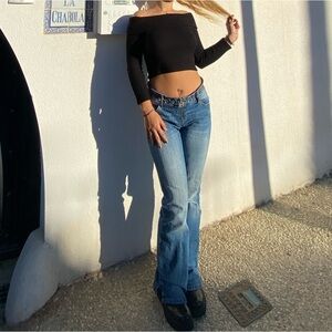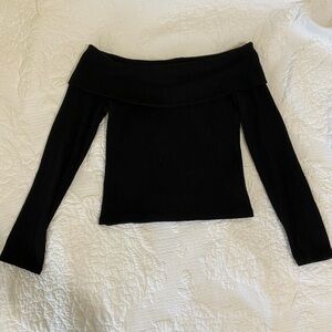 Chic off-shoulder black sweater with long sleeves. Soft ribbed knit offers a flattering, fitted silhouette. Versatile black color pairs easily with jeans or skirts. Comfortable and stylish for everyday or dress-up wear. Says size small but thats if you want a loose fit if you want a tighter cropped look I would purchase if you are a medium or medium large , even large - very stretchy