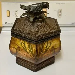 Hexagonal decorative trinket box with a bird finial. Rich antique bronze finish with golden panels featuring botanical motifs. Sturdy metal construction. Charming vintage-inspired accent piece. Great for display or small storage.