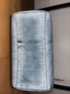 Coach satchel in light blue denim with top handles. Gold hardware and logo detail. Yellow textured tag and black dice charm. Pink leather heart tassel accent. Structured shape with zipper top.
