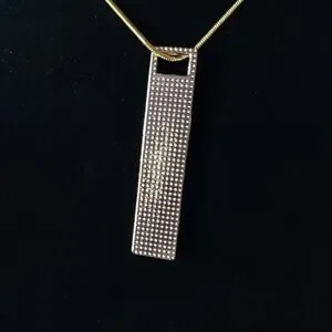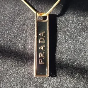 Elegant pendant necklace in gold and black. Features a sleek design with a branded charm.