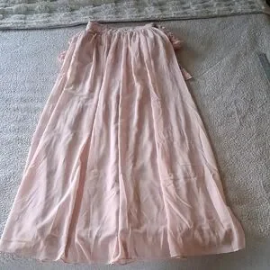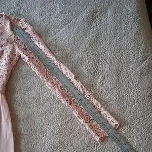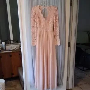 This stunning gown by Pinkblush is perfect for a bride or wedding guest, featuring a romantic pink hue and elegant bishop sleeves. The dress boasts a plunging neckline and a flowing full-length skirt, creating a timeless and ethereal silhouette. I could get a good pic of dress length, its 47" from under lace to floor.