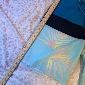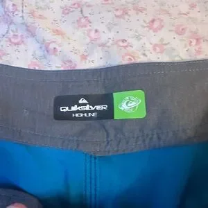 Quiksilver men’s size 33 Highline SurfSilk Panel 20” boardshorts in a blue tropical palm print.
