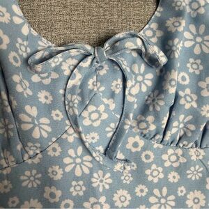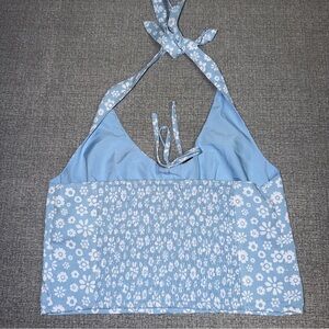 Hollister halter crop top in a light blue & white daisy floral print throughout. The front is designed with a sweetheart neckline, gathered bust detailing, halter neck tie and a fully smocked elastic back panel for a comfortable, flexible fit. The material is 100% polyester. Size medium.