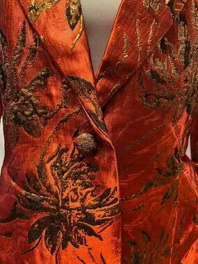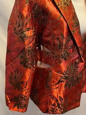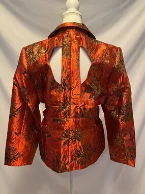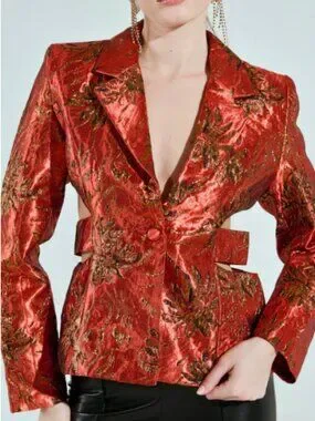 Tags: heavy brocade jacket, red brocade blazer, Akira statement jacket, cutout back jacket, cutout side jacket, editorial fashion jacket, structured brocade blazer, metallic brocade coat, bold fashion jacket, runway style blazer, unique cutout blazer, evening jacket, party jacket, fashion forward outerwear, size XL, boutique style jacket, luxury brocade fabric, modern cutout design, one button blazer, lapel collar jacket