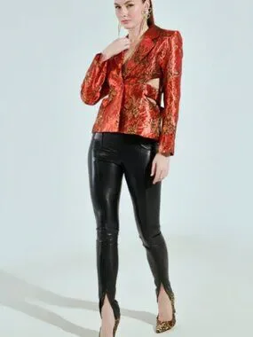 Make a bold entrance in this stunning AKIRA brocade jacket, crafted from a rich, heavy red brocade fabric with dramatic side and back cut‑out detailing. Structured, eye‑catching, and editorial in all the right ways.