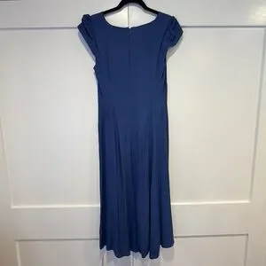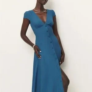 Flowing blue maxi dress by Reformation. V-neck with subtle cap sleeves. Front button closure through the skirt. Empire seam for a flattering silhouette. Lightweight, drapey fabric for easy movement.