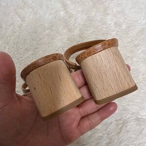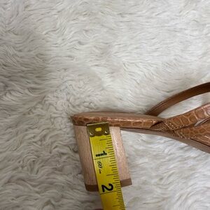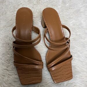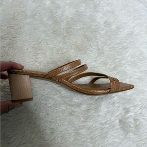 Croc-embossed leather upper with slim, elegant straps. Square toe and low block heel for stable wear. Neutral tan hue pairs easily with outfits. Sleek, minimalist silhouette for versatile styling.