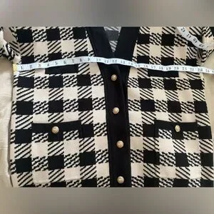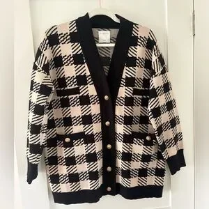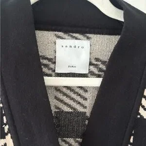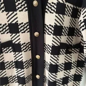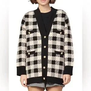 Sandro Checkered Knit Cardigan oversized Black Cream Gold Button V‑neck