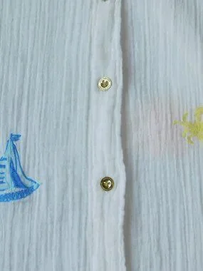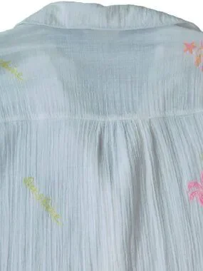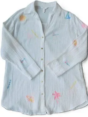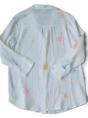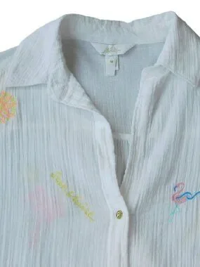 Lilly Pulitzer Kwitney Embroidered Long Sleeve Coverup in Resort White Beachcomber embroidery. Relaxed fit, button front cover-up with a collar and long sleeves. Loose fit throughout the body. Crinkle Double Gauze with Embroidery of palm trees, sailboats, flamingos, crab, sun and other Palm Beach favorites (100% Cotton). Style# 019220 PO 063164. From February 2025.