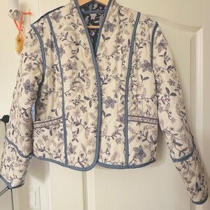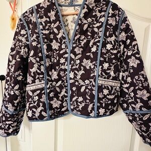 Lightweight cropped quilted jacket with blue floral print. Can be reversible. Features blue trim and a relaxed fit for easy layering.