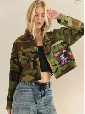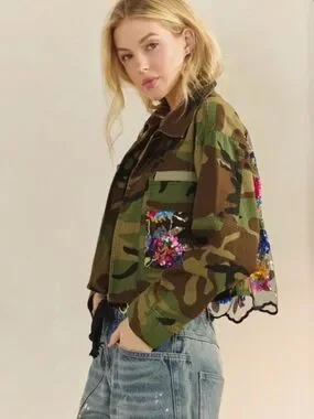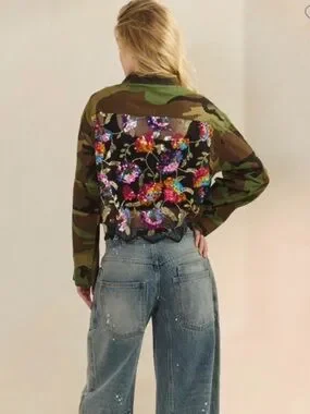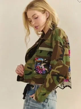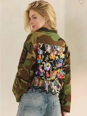 A standout camo utility jacket featuring a multicolor sequin floral back panel. Designed for casual layering with a cropped, relaxed silhouette. The green camo exterior pairs with vibrant sequin detailing for eye-catching contrast. Easy to style over tees and denim for a bold, feminine look.