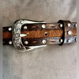 Genuine Leather Hair Studded Western Belt - Womens Large - Brown Silver Tone