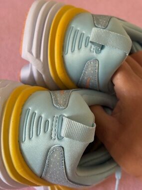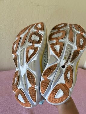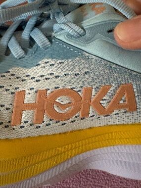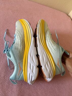 I wore these a couple of times outside hence the dirt marks on the soles but they’re practically new, as they’re a bit too big for me. Baby blue and yellow orange. Super comfy! Original Hoka shoes. Paid 180. Priced to sell fast