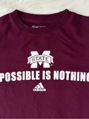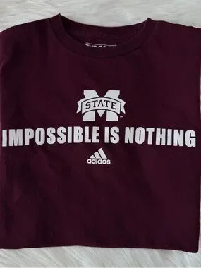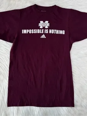Adidas Mississippi State Shirt. This short sleeve graphic tee is school's signature color, maroon. Features bold "Impossible Is Nothing" front print, along with Mississippi State logo & branded Adidas logo. Comfortable100% cotton with a classic crew neckline. The Go-To Tee by adidas is designed as a versatile, everyday staple that transitions seamlessly between athletic performance & casual wear. Perfect for any Mississippi State student, alumni or sports fan!