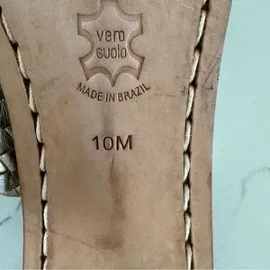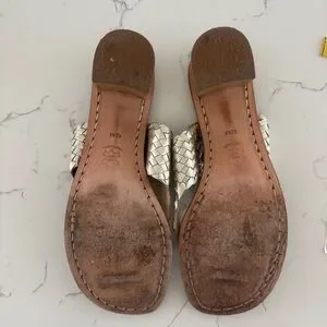 Good preowned condition with visible wear consistent with use. There is wear to the leather soles, light scuffing on left back heel and creasing throughout, and some wear to the metallic woven leather and footbeds. Overall still a very wearable pair with beautiful style.
