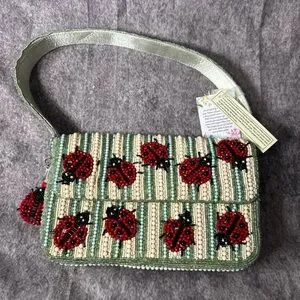 Charming beaded shoulder bag with red ladybug motifs on a mint and cream background. Lightweight and eye-catching, the mint and red colors add playful charm. Perfect for casual outings and adding a whimsical accent to any outfit.